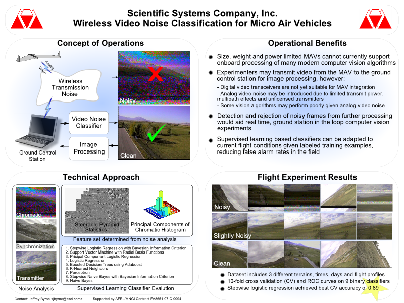- J. Byrne and R. Mehra, "Wireless Video Noise Classification for Micro Air Vehicles", Proceedings of the 2008 Association for Unmanned Vehicle Systems International (AUVSI) Conference, North America 2008, June 10-12, 2008; [pdf][poster]